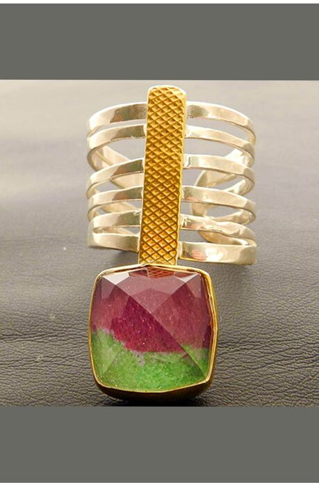 Κομψό και εντυπωσιακό αυτό το δαχτυλίδι με το Ρουμπίνι και Ζωισίτη. Αυτή την πέτρα τη συναντάμε έτσι στη φύση. Ουσιαστικά ο πράσινος ζωισίτης περικλείει το ρουμπίνι.