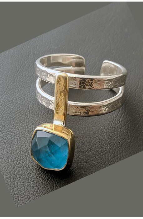 Μοντέρνο με σύγχρονο σχεδιασμό. Ένα ασημένιο δαχτυλίδι με ένα φωτεινό Απατίτη. Είναι δουλεμένο στο χέρι .