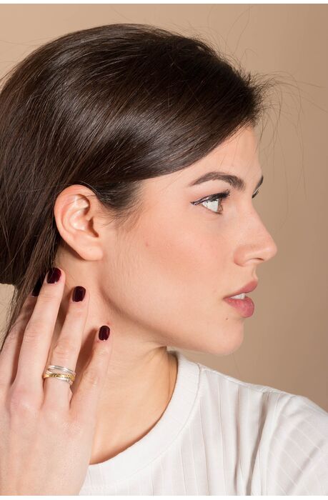 Υπέροχο ασημένιο δαχτυλίδι με επιχρυσωμένη βέρα. Το δαχτυλίδι αυτό το διακρίνει η αρχοντιά της απλότητας. Οι δύο βέρες που ενώνονται συμβολίζουν την αγάπη και την ελπίδα, ενώ η μονή οριζόντια συμβολίζει την πίστη. Φορέστε το ή χαρίσετε το στα αγαπημένα πρόσωπα, εκφράζοντας την αγάπη σας προς αυτά. Το μέγεθος είναι ρυθμιζόμενο με δυνατότητα να προσαρμόζεται εύκολα σε κάθε δάχτυλο. Συνοδεύεστε τις καλύτερες στιγμές της ζωής σας, φορώντας αυτό το δαχτυλίδι.