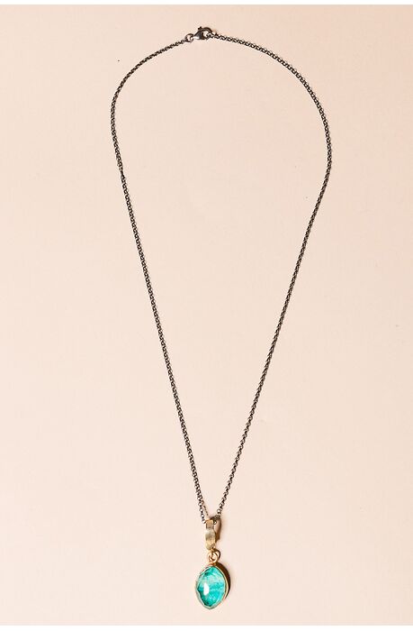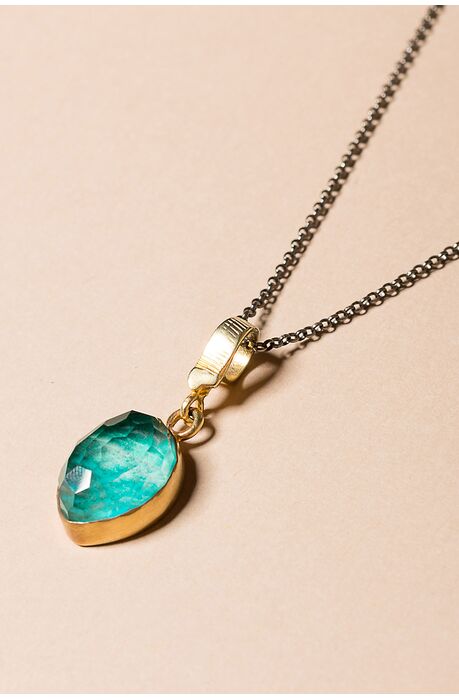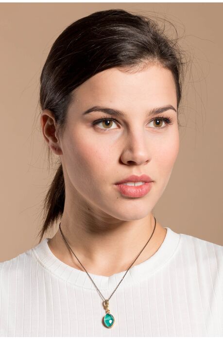 Ένα κόσμημα με μοντέρνο σχεδιασμό που έχει μελετηθεί για το απολαύσετε καθημερινά. Η εντυπωσιακή Χρυσόκολλα (μια πέτρα από το Περού) είναι εξαιρετικής ποιότητας και έχει ένα υπέροχο πράσινο-μπλε χρώμα που φωτίζεται από τον αστραφτερό χαλαζία που το σκεπάζει. Θαυμάστε το χρώμα της υπέροχης αυτής πέτρας. Θυμίζει τα γαλάζια νερά της θάλασσας.
