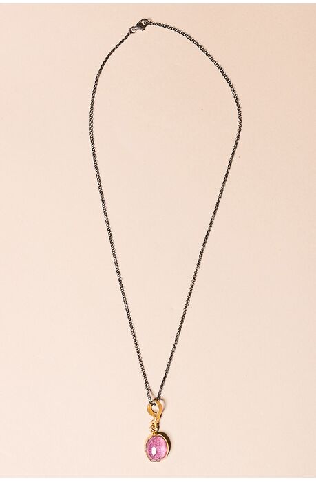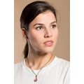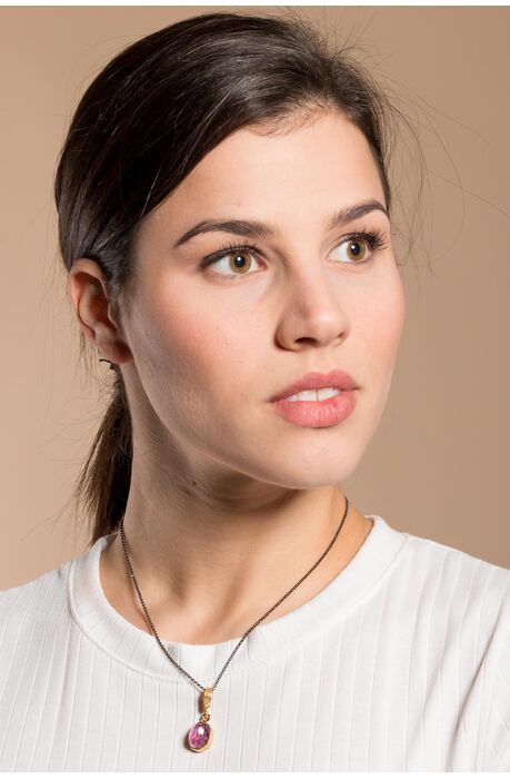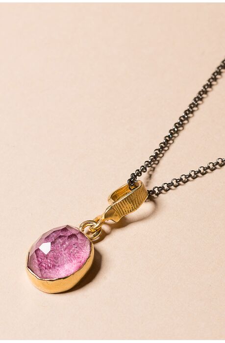 Υπέροχο κολιέ δουλεμένα στο χέρι, για λεπτά γούστα. Ενα κόσμημα με μοντέρνο σχεδιασμό. Το φωτεινό ρουμπίνι είναι εξαιρετικής ποιότητας και έχει ένα υπέροχο δαμασκηνί χρώμα που φωτίζεται από τον αστραφτερό χαλαζία που το σκεπάζει.