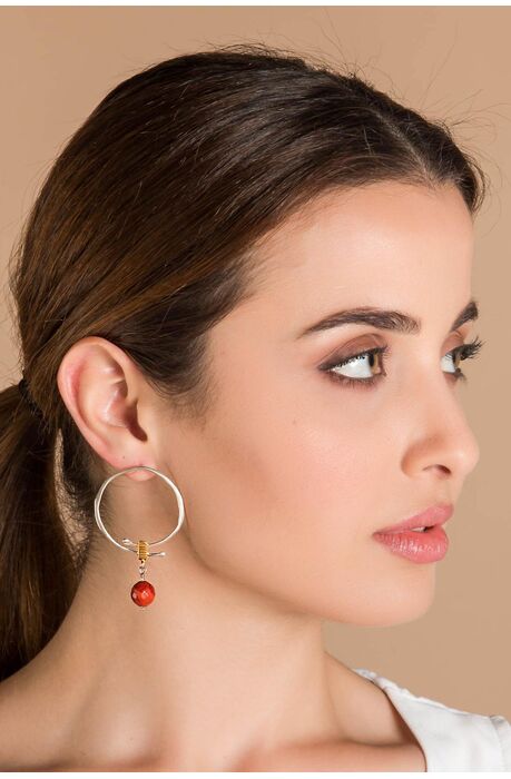 Ασημένια χειροποίητα σκουλαρίκια σε σχήμα κύκλου με κρεμαστό στοιχείο απο κοράλλι .