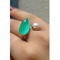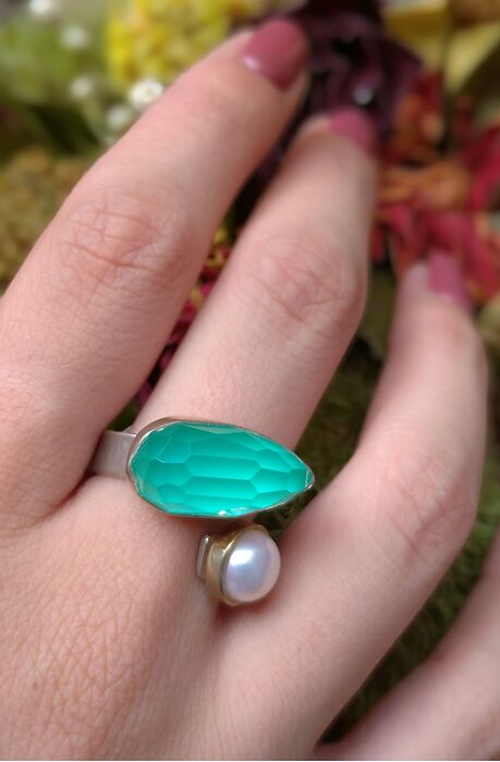 Χειροποίητο Ασημένιο Δαχτυλίδι 925 με ημιπολύτιμη πέτρα Aquapraseκαι μαργαριτάρι perla