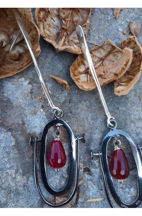 Υπέροχα, μινιμαλ, χειροποίητα σκουλαρίκια από ασήμι 925 με μαύρη πλατίνα με δύο Αχάτες στο χρώμα του Ρουμπινιού. .Με αυτά τα κομψά σκουλαρίκια θα δώσετε μια λεπτή και θηλυκή λεπτομέρεια σε οποιαδήποτε εμφάνιση σας .Το σχέδιο είναι μοναδικό, και μπορείτε να τα φορέσετε με κάθε εμφάνιση casual ή glam. Λεπτά και ελαφριά, είναι τέλεια για να τονίσουν την παρουσία σας