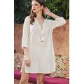 Δροσερό βαμβακερό καφτάνι-φόρεμα με υπέροχο χειροποίητο κέντημα με χάντρες στο μπούστο. Δύο καλοραμμένα κορδόνια που καταλήγουν σε φουντίτσες, κλείνουν το άνοιγμα στο στήθος.
