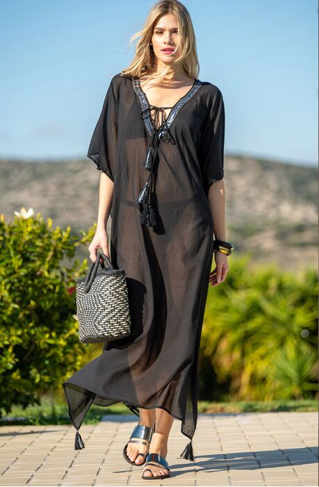 Δροσερό βαμβακερό καφτάνι-φόρεμα με υπέροχο χειροποίητο κέντημα στο μπούστο σε ίσια γραμμή