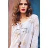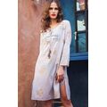 Δροσερό βαμβακερό καφτάνι-φόρεμα με υπέροχο χειροποίητο διακριτικό κέντημα με λαμπερά στοιχεία στο μπούστο. Δύο καλοραμμένα κορδόνια που καταλήγουν σε φουντίτσες, κλείνουν το άνοιγμα στο στήθος.