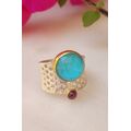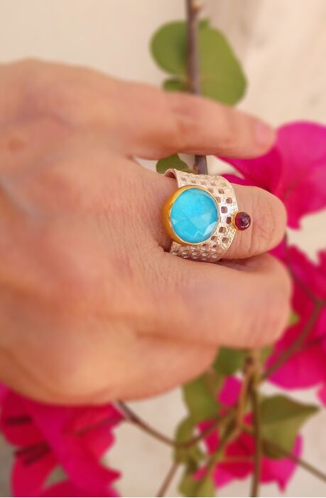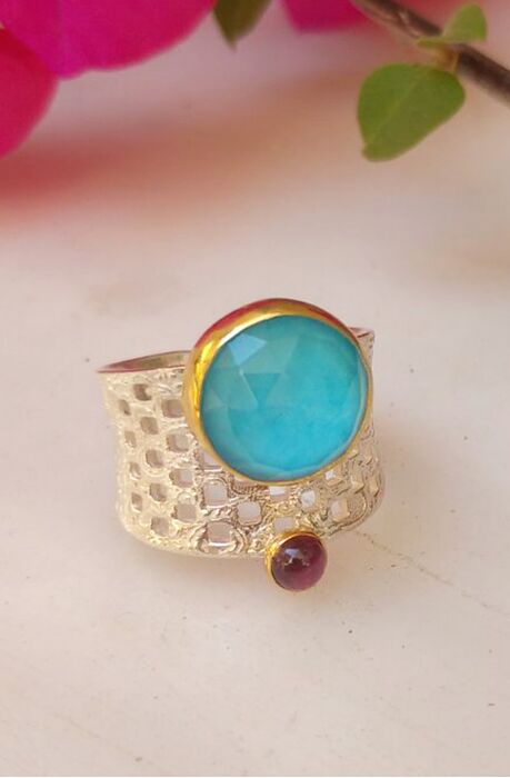 Μοντέρνο με σύγχρονο σχεδιασμό. Ένα ασημένιο δαχτυλίδι με ένα φωτεινό Τυρκουάζ και μια μικρότερη Γρανάδα. Είναι δουλεμένο στο χέρι .